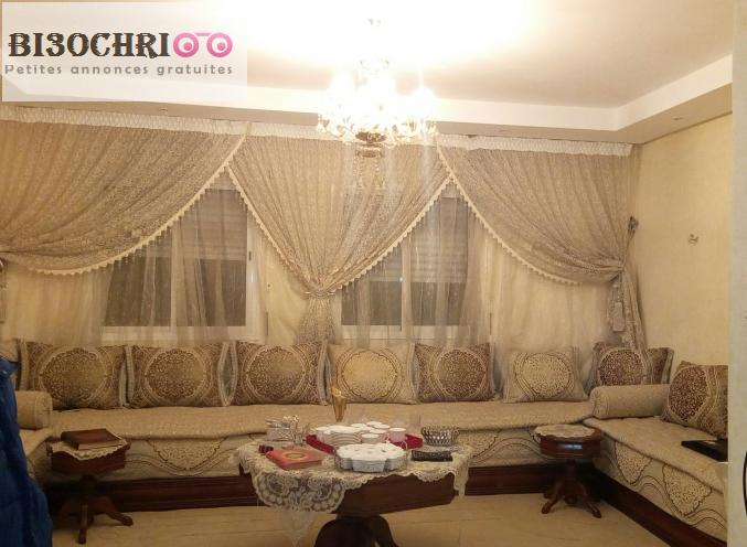 Bonjour cause de déménagement je mets en vente un salon marocain complet qui se compose de: 4 banquettes en bois + table + 2 cendriers+ les matelas + tlamet + l7ayef + khdadi remplis + tapis + rideau et lustre. les mesures du salon: ( 2m.5 m chacun / 70 cm + ) voir les photos merci.